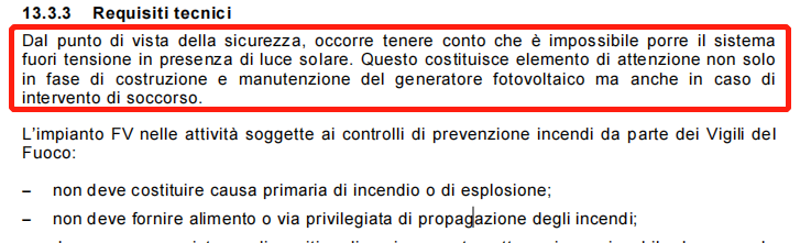 意大利標(biāo)準(zhǔn) CEI 82-25標(biāo)準(zhǔn)明確指出:“從安全的角度來(lái)看,必須考慮到在有陽(yáng)光的情況下無(wú)法安全關(guān)閉光伏系統(tǒng)的情況。這不僅是光伏發(fā)電系統(tǒng)的建造和維護(hù)階段的一個(gè)注意事項(xiàng),而且在緊急干預(yù)的情況下也是如此。”