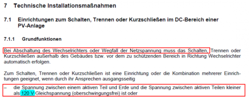 根據(jù)德國(guó)標(biāo)準(zhǔn) VDE-AR-E 2100-712要求:在光伏系統(tǒng)中如果逆變器關(guān)閉或者電網(wǎng)出現(xiàn)故障時(shí),需要使直流電壓小于120V。其中,提到了可以使用關(guān)斷裝置使直流側(cè)電壓降至120V以下。