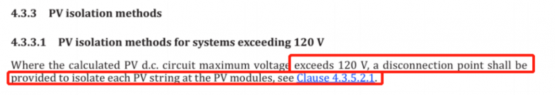 根據(jù)最新AS/NZS 5033:2021標(biāo)準(zhǔn)的4.3.3章節(jié)提到:當(dāng)直流電壓大于120Vd.c時(shí),組件和逆變器之間需要安裝斷開裝置。