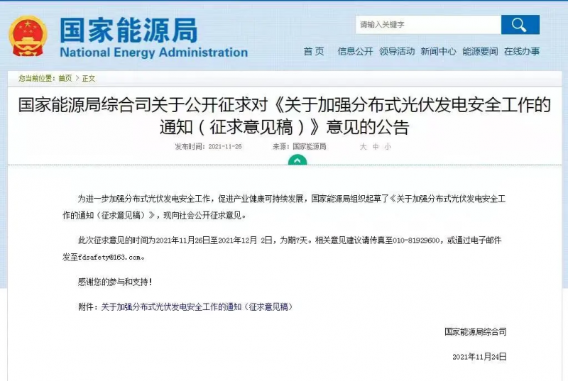 2021年11月26日,國(guó)家能源局發(fā)布了關(guān)于公開征求對(duì)《關(guān)于加強(qiáng)分布式光伏發(fā)電安全工作的通知(征求意見稿)》意見的公告。其中,在“項(xiàng)目設(shè)計(jì)管理”相關(guān)章節(jié)中明確要求:安裝電弧故障斷路器或采用具有相應(yīng)功能的組件,實(shí)現(xiàn)電弧智能檢測(cè)和快速切斷功能;光伏組件應(yīng)具有安全關(guān)斷保護(hù)功能,保證逆變器關(guān)機(jī),交流斷電后,系統(tǒng)子陣外直流電壓低于安全電壓。