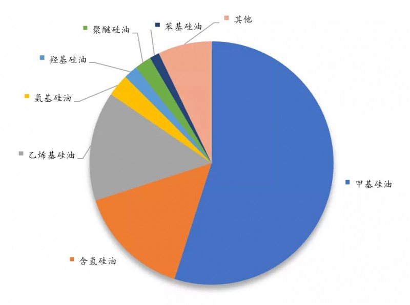 國內本土企業(yè)的產(chǎn)品多集中在中低端,如常規(guī)甲基硅油,含氫硅油等,該類產(chǎn)品近幾年呈現(xiàn)與單體廠緊密共生的特征,份額逐步向上游企業(yè)集中。由于過去幾年硅橡膠等下游產(chǎn)品發(fā)展較快,乙烯基硅油等產(chǎn)品的發(fā)展速度也與之相匹配。其他種類硅油如聚醚硅油、氨基硅油、嵌段硅油等特種硅油的產(chǎn)量份額較低,但消費增速近幾年有加速態(tài)勢。部分以技術見長的中小企業(yè)為規(guī)避常規(guī)硅油產(chǎn)品的激烈競爭,轉向發(fā)展特種硅油。各種類型的硅油市場份額如圖1所示。