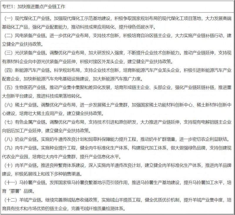 2月9日,內(nèi)蒙古自治區(qū)人民政府發(fā)布了《關(guān)于下達(dá)2022年內(nèi)蒙古自治區(qū)國民經(jīng)濟(jì)和社會發(fā)展計(jì)劃的通知》。通知提出,加快推進(jìn)光伏裝備產(chǎn)業(yè)鏈等重點(diǎn)產(chǎn)業(yè)鏈工作,包括調(diào)整優(yōu)化產(chǎn)業(yè)布局,加大研發(fā)投入強(qiáng)度,不斷提升企業(yè)技術(shù)創(chuàng)新能力;推動產(chǎn)業(yè)鏈延伸,支持現(xiàn)有原材料企業(yè)向中游光伏裝備產(chǎn)業(yè)延伸,積極對接區(qū)外龍頭企業(yè),建立健全產(chǎn)業(yè)扶持政策。
