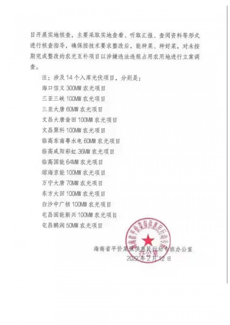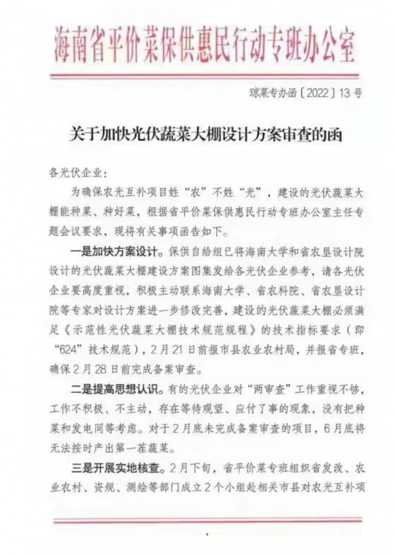 2月12日,海南省平價(jià)菜保供惠民行動(dòng)專班辦公室發(fā)布了關(guān)于加快光伏蔬菜大棚設(shè)計(jì)方案審查的函。為確保農(nóng)光互補(bǔ)項(xiàng)目姓"農(nóng)"不姓"光",建設(shè)的光伏蔬菜大棚能種菜、種好菜,根據(jù)省平價(jià)菜保供惠民行動(dòng)專班辦公室主任專題會(huì)議要求,明確了以下事項(xiàng):