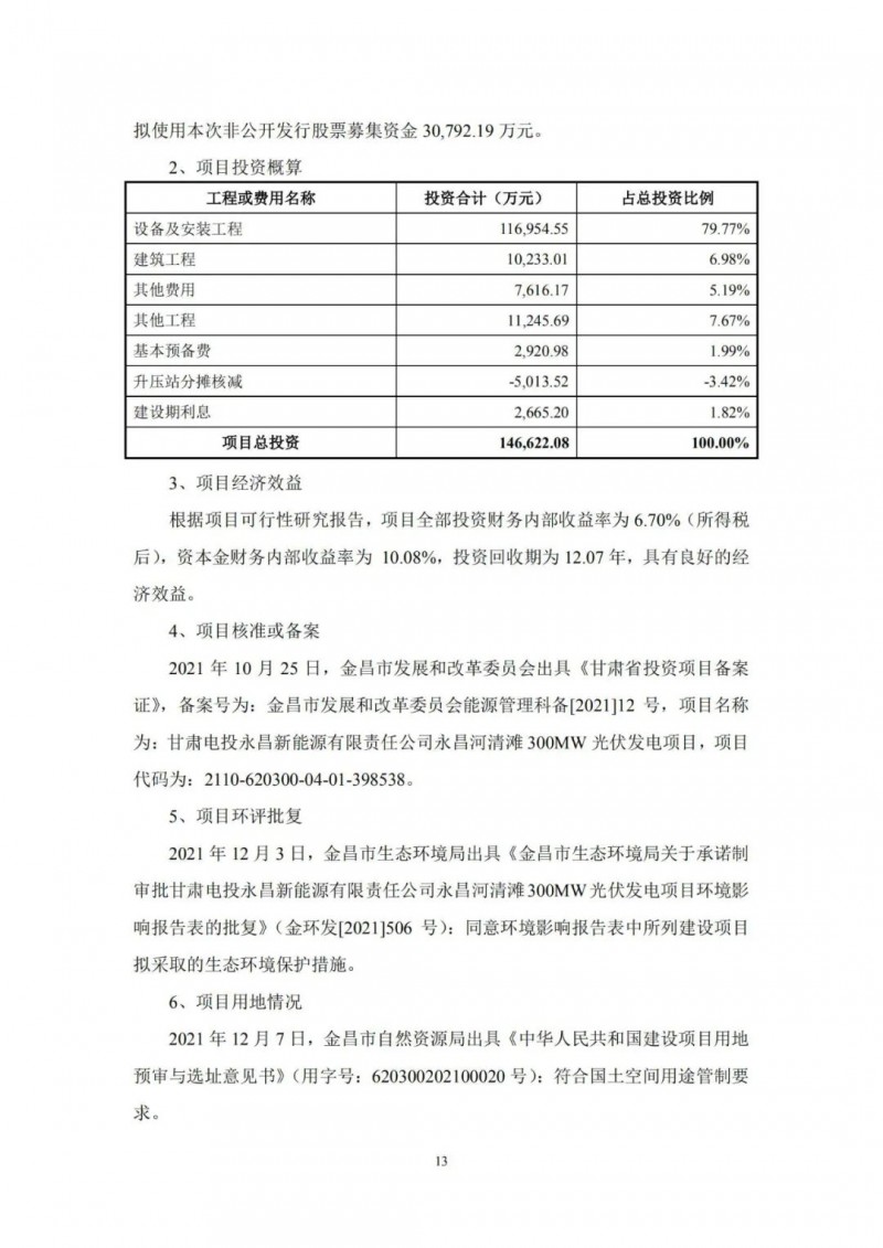 2月21日,甘肅電投發(fā)布公告,擬定增募資不超過12億元,用于玉門市麻黃灘第一風(fēng)電場C區(qū)200兆瓦項(xiàng)目、瓜州干河口200MW光伏項(xiàng)目、永昌河清灘300MW光伏發(fā)電項(xiàng)目、高臺(tái)縣鹽池灘100MW風(fēng)電場項(xiàng)目及補(bǔ)充流動(dòng)資金。天眼查app顯示,公司是于1997年7月8日經(jīng)甘肅省人民政府甘政函[1997]36號(hào)文件批準(zhǔn),由西北油漆廠獨(dú)家發(fā)起,部分改制,采用募集設(shè)立方式設(shè)立的股份有限公司。公司1997年8月29日向社會(huì)公眾公開發(fā)行4500萬股人民幣普通股,并于1997年9月23在甘肅省工商行政管理局登記注冊(cè)。1997年10月14日經(jīng)中國證券監(jiān)督管理委員會(huì)批準(zhǔn),公司股票在深圳證券交易所上市交易。自2012年12月21日起,公司名稱由"西北永新化工股份有限公司"變更為"甘肅電投能源發(fā)展股份有限公司"。