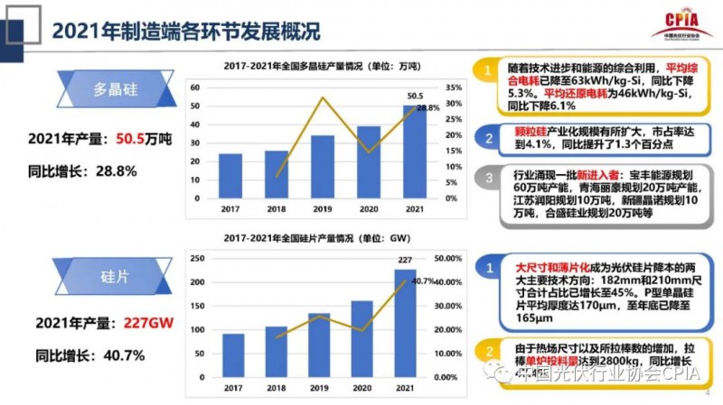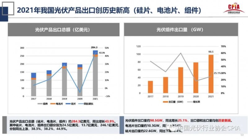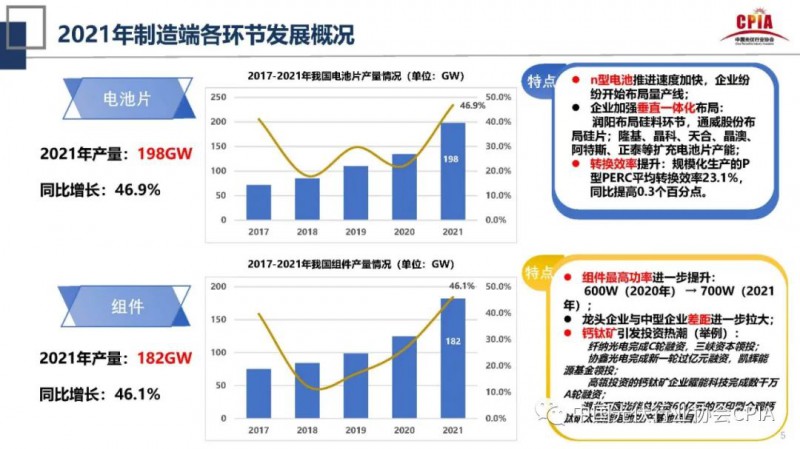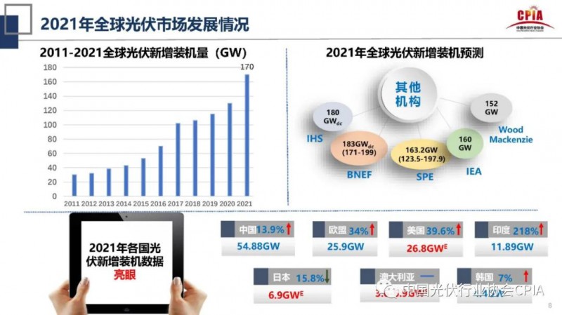 2022年2月23日,2021年發(fā)展回顧與2022年形勢展望線上研討會采用直播形式順利召開,中國光伏行業(yè)協(xié)會名譽(yù)理事長王勃華出席會議并作2021年光伏行業(yè)發(fā)展回顧與2022年形勢展望,王勃華指出,2021年我國光伏行業(yè)繼續(xù)高歌猛進(jìn),制造端,應(yīng)用端,進(jìn)出口都取得了快速增長,2022年我國光伏市場在巨大的規(guī)模儲備下或?qū)⒃鲋?5GW以上。