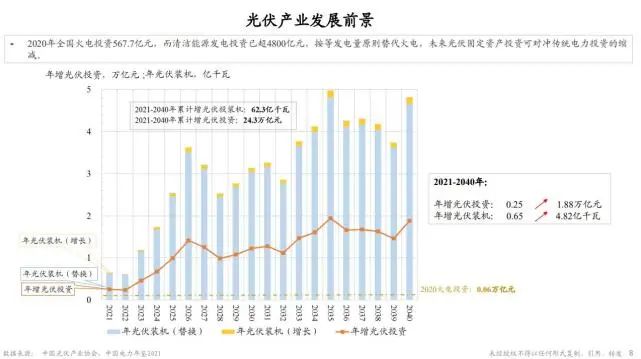 按照剛才的演進(jìn)路徑,光伏產(chǎn)業(yè)投資假如從2021年開(kāi)始,新增的電源都是由光伏裝機(jī)來(lái)實(shí)現(xiàn),那么下面這張圖就展示了未來(lái)的20年的一個(gè)投資逐漸增加的過(guò)程,從開(kāi)始大概0.25萬(wàn)億,到后來(lái)大概2萬(wàn)億的年投資,整個(gè)全過(guò)程完成約20年,總共的投資規(guī)模大概是20多萬(wàn)億元。