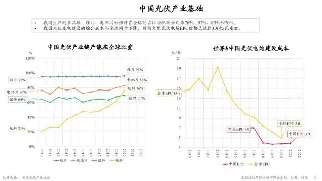 同時(shí)可以看一下中國(guó)的光伏產(chǎn)業(yè)基礎(chǔ)。從下面的左圖可以看出來(lái),中國(guó)光伏產(chǎn)業(yè)鏈的各個(gè)環(huán)節(jié)在全球占據(jù)了很大的比重,包括硅料的生產(chǎn)也是在迅速提升??从疫呥@張圖,中國(guó)光伏電站建設(shè)成本也是系統(tǒng)性下降,同時(shí)顯著低于全球的成本水平。