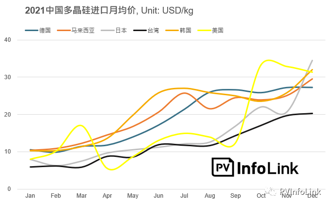 多晶硅市場在2021年經(jīng)歷了較大的動蕩,因整體光伏供應鏈的產(chǎn)能錯配,使得硅料價格整年大都維持上漲態(tài)勢。除了中國國內(nèi)市場多晶硅交易價格上漲外,連帶使得價格相對平穩(wěn)的海外料價格也出現(xiàn)較大的波動,全年價格趨勢同樣呈現(xiàn)上升趨勢。PV Infolink透過統(tǒng)計2020 – 2021中國海關(guān)的多晶硅進口信息,分析變化原因與未來影響。