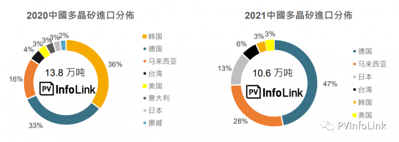 2021年進口多晶硅主要來自德國和馬來西亞,兩者占比達到了75%,主因兩國擁有瓦克和OCI兩家目前生產(chǎn)較為穩(wěn)定的非中國廠家。與2020年比較,出口多晶硅到中國的國家數(shù)量減少,且過去占據(jù)進口量第一名的韓國占比快速縮小,在韓國國內(nèi)生產(chǎn)設(shè)施目前沒有重啟的意愿下,預期未來占比將趨近于0%。其他來自日本或是臺灣的多晶硅進口,因該地區(qū)沒有多晶硅生產(chǎn)設(shè)施,可能是過去所簽訂的多晶硅長單未完全使用而轉(zhuǎn)售,但也僅有小量的占比。