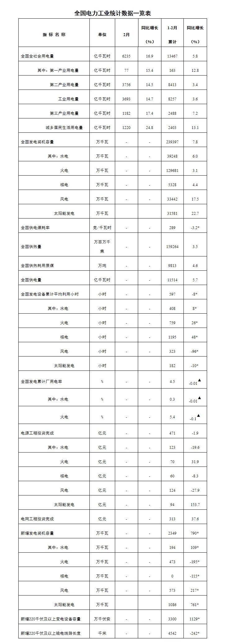 注:1.全社會(huì)用電量為全口徑數(shù)據(jù),全國(guó)供電量為調(diào)度口徑數(shù)據(jù)。2.“同比增長(zhǎng)”列中,標(biāo)*的指標(biāo)為絕對(duì)量;標(biāo)▲的指標(biāo)為百分點(diǎn)。