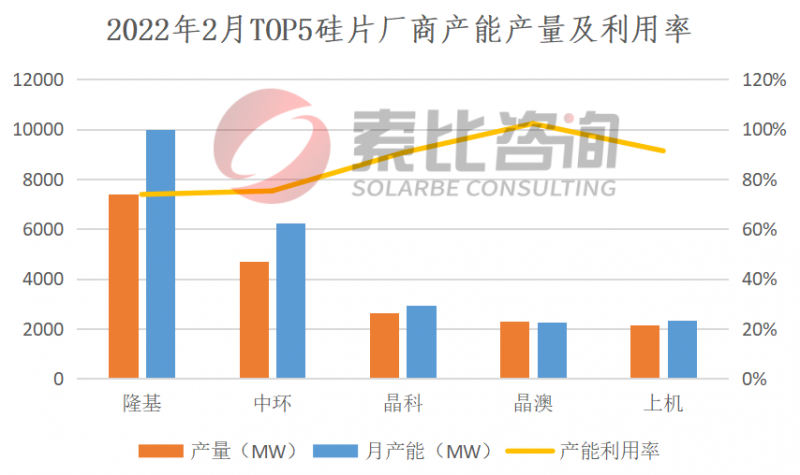 2022年2月,盡管一線企業(yè)開工率提升超過70%,但硅片仍供不應(yīng)求。2022年2月國內(nèi)硅片產(chǎn)量24.9GW,環(huán)比增長20.9%。按照產(chǎn)量排名,隆基、中環(huán)、晶科、晶澳、上機位列前五,企業(yè)總產(chǎn)量19.15GW,占比76.91%,綜合利用率86.6%。預(yù)計3月份硅片繼續(xù)維持供不應(yīng)求態(tài)勢。從供應(yīng)端來看,3月份基礎(chǔ)產(chǎn)量已達上限。從需求端來看,海外需求刺激預(yù)期將延續(xù)至3月底。