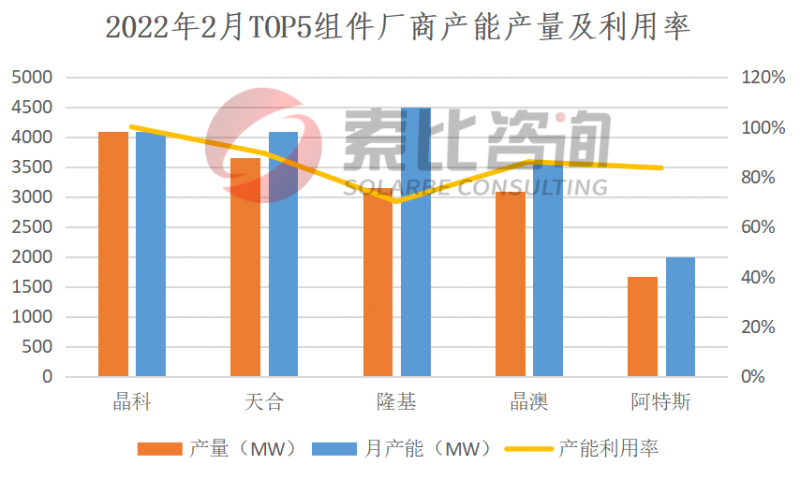2022年2月,海內(nèi)外市場組件需求旺盛,國內(nèi)組件產(chǎn)量25.5GW,環(huán)比大增22.63%。一方面,國內(nèi)部分地面電站項目補裝、央國企組件開標(biāo)規(guī)模近40GW,一方面,印度即將實施新的關(guān)稅政策引發(fā)搶裝。按照產(chǎn)量排名,晶科、天合、隆基、晶澳、阿特斯位列前五,企業(yè)總產(chǎn)量15.63GW,占比61.29%,綜合開工率85.75%。預(yù)計2022年3月,組件需求和排產(chǎn)基本維持2月水平,國內(nèi)電站補裝及印度搶裝效應(yīng)逐步淡化。