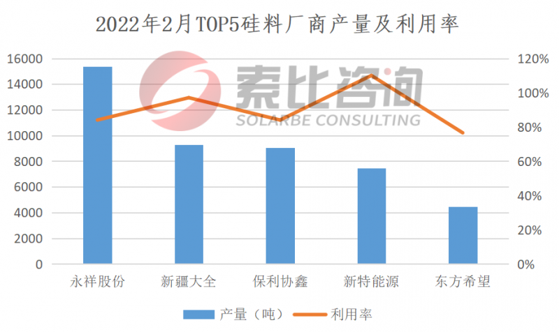 2022年2月,國內(nèi)13家多晶硅企業(yè)在產(chǎn),大全、永祥、協(xié)鑫、新特擴產(chǎn)增量釋放,產(chǎn)量小幅增加。2月份國內(nèi)多晶硅產(chǎn)量為5.23萬噸(約20.66GW),環(huán)比增長0.58%。按照產(chǎn)量排名,永祥、大全、協(xié)鑫、新特、東方希望位列前五,企業(yè)總產(chǎn)量4.57萬噸,占比87.4%,綜合利用率90.3%。索比咨詢預(yù)期3月份硅料產(chǎn)量繼續(xù)小幅上漲。從供應(yīng)端來看,國內(nèi)外終端需求上升,硅片企業(yè)開工率持續(xù)提升,硅料擴產(chǎn)釋放亦有增量,預(yù)計3月份協(xié)鑫、永祥、新特等企業(yè)擴產(chǎn)產(chǎn)能仍有釋放增量。從需求端來看,供應(yīng)量增長,價格有望松動,進一步刺激下游需求。