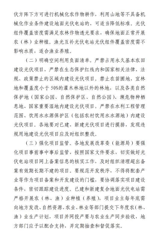 用地方面,允許在設(shè)施農(nóng)業(yè)上建設(shè)農(nóng)光互補(bǔ)、菌光互補(bǔ)項(xiàng)目,利用農(nóng)用地布設(shè)的光伏方陣可不改變?cè)玫匦再|(zhì)。光伏復(fù)合項(xiàng)目應(yīng)堅(jiān)持“以農(nóng)為先”,新建復(fù)合地面光伏電站光伏組件安裝高度最低處不低于2米,方陣前后陣列中心間距原則上不少于7米。嚴(yán)禁占用永久基本農(nóng)田、在生態(tài)保護(hù)紅線內(nèi)以及各類自然保護(hù)地建設(shè)光伏項(xiàng)目。此外,已建和新建復(fù)合地面光伏電站需嚴(yán)格開(kāi)展農(nóng)(林、漁)業(yè)種植(養(yǎng)殖),項(xiàng)目業(yè)主每年底需向地方發(fā)改委、自然資源、農(nóng)業(yè)、林業(yè)等部門提交下年度農(nóng)(林、漁)業(yè)生產(chǎn)計(jì)劃,項(xiàng)目并網(wǎng)投產(chǎn)要與農(nóng)業(yè)生產(chǎn)同步驗(yàn)收。