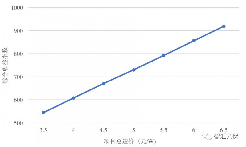 當(dāng)經(jīng)營(yíng)成本按照0.1元/W考慮時(shí),不同“初始投資”下,IRR要達(dá)到8%,“綜合收益指數(shù)”對(duì)應(yīng)的數(shù)值如下圖所示。