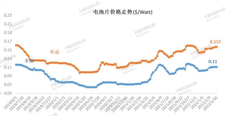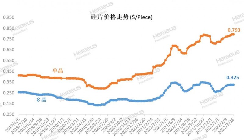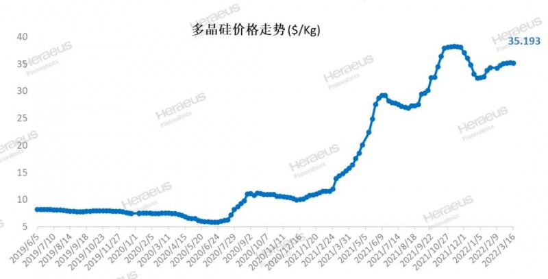 隨著1、2月份裝機量的大幅增長,下游市場需求持續(xù)走高,多晶硅價格保持高位并略有上漲。考慮到硅料新擴產(chǎn)能釋放周期,短期內不會對硅料價格有明顯影響。