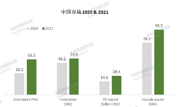 根據(jù)中國光伏協(xié)會今年二月份數(shù)據(jù),2021年中國裝機量突破了54.9GW, 和2020年相比增長了13.9%。其中分布式光伏裝機量首次超過了50%。