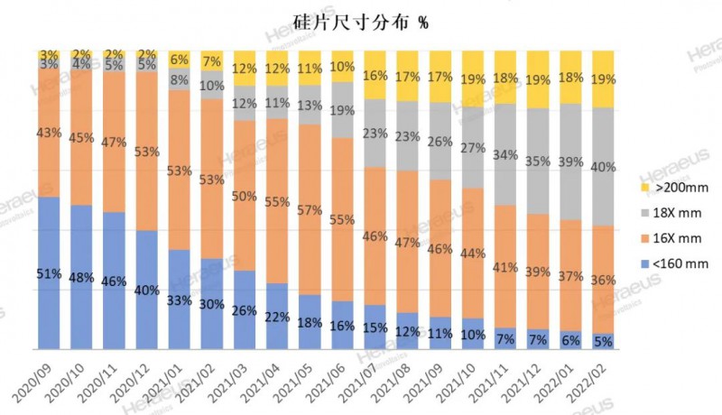 經(jīng)歷了短短不到一年半的時間,大尺寸硅片(≥M6)的市場占有率從2020年9月的49%迅速爬坡至95%。