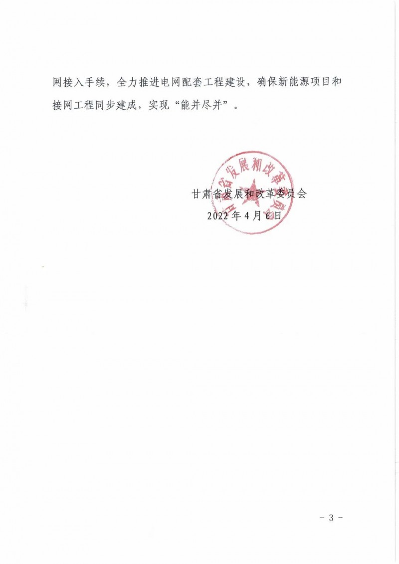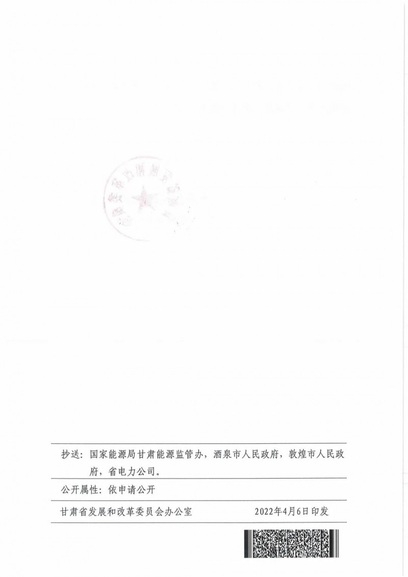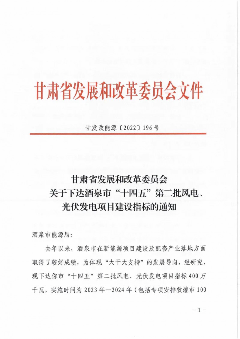 4月6日,甘肅省發(fā)展和改革委員會(huì)下發(fā)《關(guān)于下達(dá)酒泉市“十四五”第二批風(fēng)電、光伏發(fā)電項(xiàng)目建設(shè)指標(biāo)的通知》(甘發(fā)改能源〔2022)196號(hào))?!锻ㄖ诽岢鼍迫?quot;十四五"第二批風(fēng)電、光伏發(fā)電項(xiàng)目指標(biāo)為400萬(wàn)千瓦,實(shí)施時(shí)間為2023-2024年(包括專項(xiàng)安排敦煌市100萬(wàn)千瓦),均為市場(chǎng)化消納項(xiàng)目,其中風(fēng)電200萬(wàn)千瓦,光伏發(fā)電200萬(wàn)千萬(wàn)。
