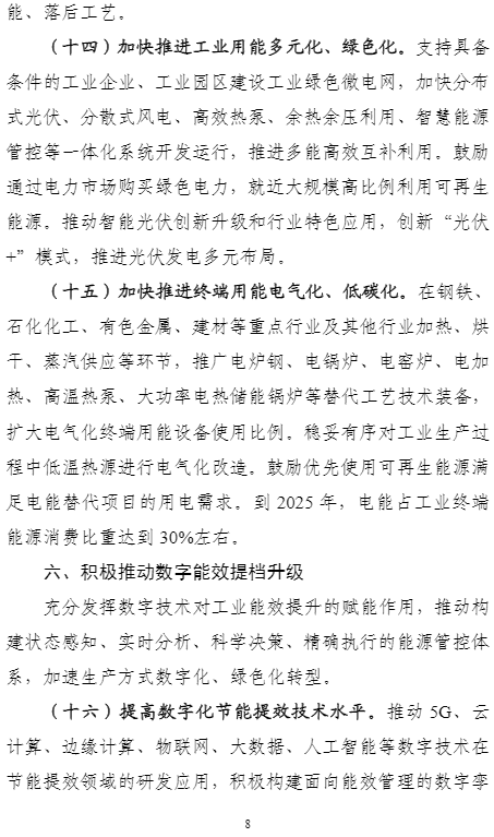 加快推進終端用能電氣化、低碳化。在鋼鐵、石化化工、有色金屬、建材等重點行業(yè)及其他行業(yè)加熱、烘干、蒸汽供應等環(huán)節(jié),推廣電爐鋼、電鍋爐、電窯爐、電加熱、高溫熱泵、大功率電熱儲能鍋爐等替代工藝技術裝備,擴大電氣化終端用能設備使用比例。穩(wěn)妥有序對工業(yè)生產(chǎn)過程中低溫熱源進行電氣化改造。鼓勵優(yōu)先使用可再生能源滿足電能替代項目的用電需求。到2025年,電能占工業(yè)終端能源消費比重達到30%左右。