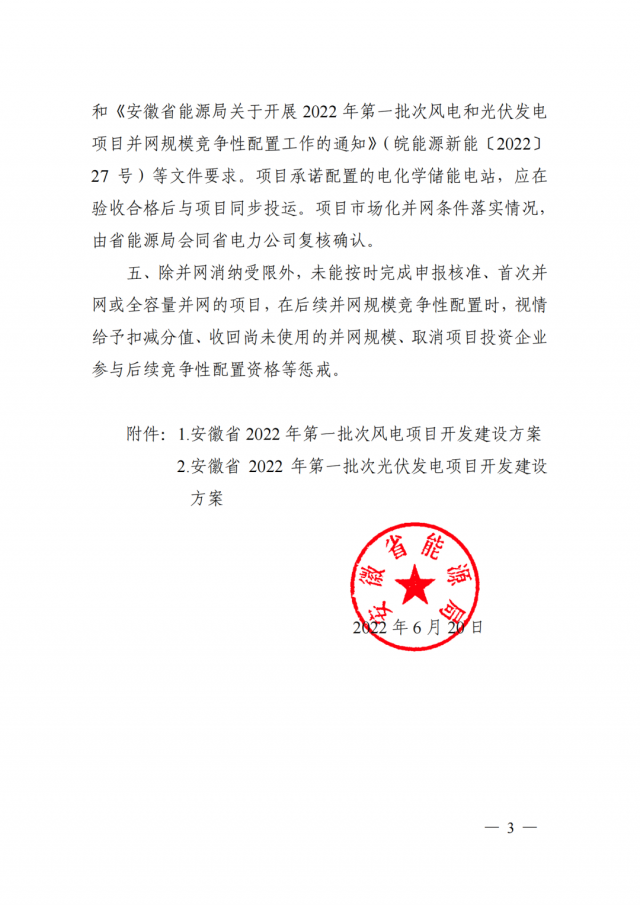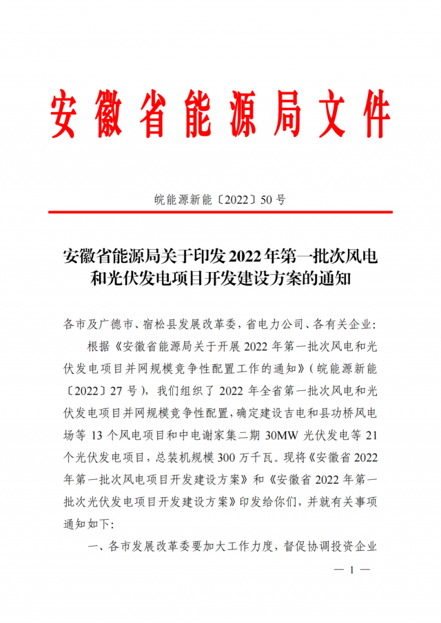 6月20日,安徽省能源局正式下發(fā)了《關(guān)于2022年第一批次風(fēng)電和光伏發(fā)電項(xiàng)目開發(fā)建設(shè)方案》的通知。根據(jù)該通知,安徽省2022年全省第一批次風(fēng)電和光伏發(fā)電項(xiàng)目并網(wǎng)規(guī)模競(jìng)爭(zhēng)性配置,確定建設(shè)21個(gè)光伏發(fā)電項(xiàng)目和13個(gè)風(fēng)電項(xiàng)目,總裝機(jī)規(guī)模300萬千瓦,其中光伏200萬千瓦、風(fēng)電100萬千瓦。