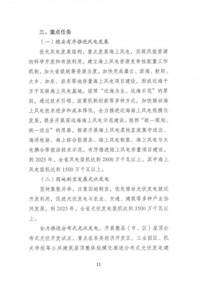 ● 擴大可再生能源裝機規(guī)模:到2025年,全省可再生能源裝機力爭達到6600萬千瓦以上,省內(nèi)可再生能源裝機占總裝機比重超過34%。其中,風電裝機達到2800萬千瓦以 上,光伏發(fā)電裝機達到 3500 萬千瓦以上,生物質(zhì)發(fā)電裝機達到300萬千瓦以上,另外,抽水蓄能裝機達到328萬千瓦 以上,實現(xiàn)電力裝機結(jié)構(gòu)有新跨越。