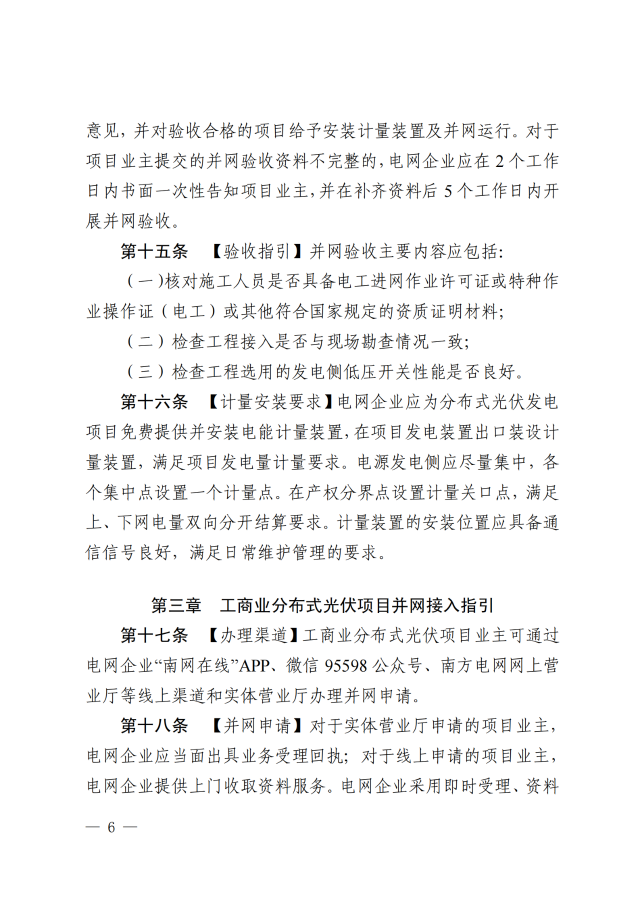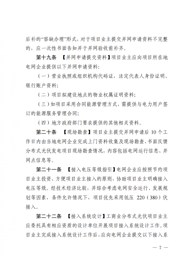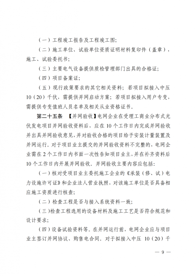 2、現(xiàn)行政策要求的其它相關(guān)資料。電網(wǎng)企業(yè)應(yīng)在5個工作日內(nèi)完成并網(wǎng)驗收并出具并網(wǎng)驗收意見,并對驗收合格的項目給予安裝計量裝臵及并網(wǎng)運行。對于項目業(yè)主提交的并網(wǎng)驗收資料不完整的,電網(wǎng)企業(yè)應(yīng)在2個工作日內(nèi)書面一次性告知項目業(yè)主,并在補(bǔ)齊資料后5個工作日內(nèi)開展并網(wǎng)驗收。