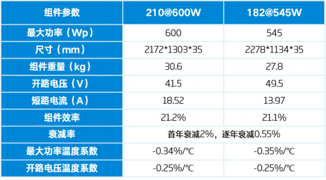 擬采用210硅片組件600W,182硅片組件545W進行行排布對比,各組件參數(shù)如下: