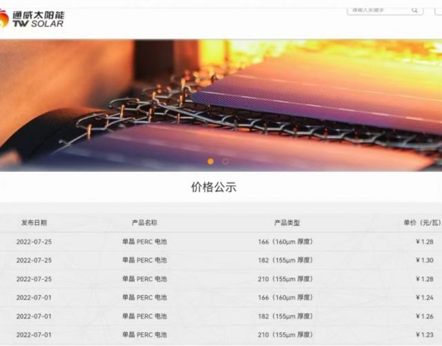 ? 7月25日,通威太陽能官網(wǎng)公布了最新的單晶太陽能電池片定價,不同尺寸的電池片價格上漲4~5分/W;預示著組件價格也會有相應的上漲。