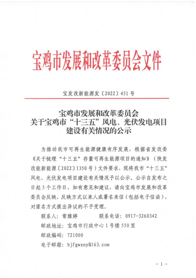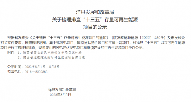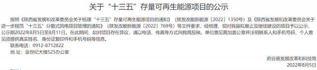 根據(jù)省發(fā)展改革委《關(guān)于梳理“十三五”存量可再生能源項(xiàng)目的通知》(陜發(fā)改能新能源〔2022〕1350號(hào))文件要求,現(xiàn)將我市擬上報(bào)省發(fā)改委“十三五”風(fēng)電、光伏發(fā)電項(xiàng)目建設(shè)有關(guān)情況予以公示。公示自發(fā)布之日起5個(gè)工作日,如有意見(jiàn)和建議,請(qǐng)向渭南市發(fā)展和改革委員會(huì)反映,反映方式以來(lái)人或署名來(lái)信(包括電子信函),對(duì)匿名方式提出異議的不予受理。