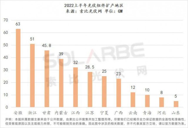 據(jù)索比光伏網(wǎng)統(tǒng)計(jì),上半年電池組件擴(kuò)產(chǎn)合計(jì)超650GW,其中電池?cái)U(kuò)產(chǎn)規(guī)模292.5GW,組件擴(kuò)產(chǎn)規(guī)模360.5GW,均大幅超出終端市場需求。隆基(66GW)、晶科(52GW)、晶澳(36GW)、東方希望(35GW)、東方日升(30GW)等企業(yè)領(lǐng)銜擴(kuò)產(chǎn)。從擴(kuò)產(chǎn)地區(qū)來看,電池?cái)U(kuò)產(chǎn)主要集中在四川、江蘇、內(nèi)蒙古、浙江、安徽等地,而組件擴(kuò)產(chǎn)主要集中在安徽、浙江、甘肅、內(nèi)蒙古、江西等地。