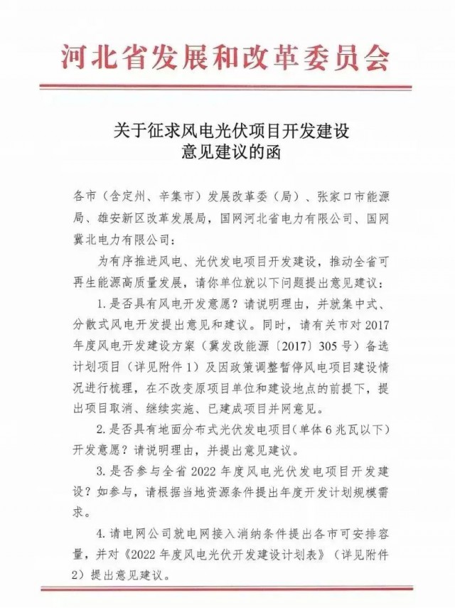 在征求意見函中,河北省發(fā)改委要求各地主管部門就風電、地面分布式光伏開發(fā)意愿進行說明,并請電網(wǎng)公司就電網(wǎng)接入消納條件提出各市可安排容量,并對《2022年度風電光伏開發(fā)建設計劃表》提出意見建議。