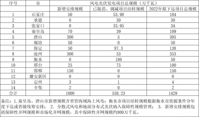 根據(jù)公示的2022年風光開發(fā)建設規(guī)模表,河北省2022年擬下達風光項目14.29GW,分布在石家莊、承德、張家口、秦皇島等14個市。其中,已取消、調(diào)減項目結轉(zhuǎn)規(guī)模5.58GW,新增規(guī)模規(guī)模為10GW。