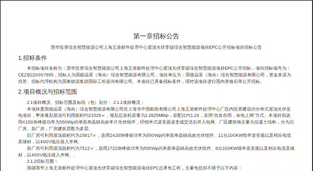 2022年對于郵件處理中心裝光伏的投資也逐漸火熱。9月13日,上海市中國郵政有限公司廠區(qū)內(nèi)投資建設的分布式屋頂光伏發(fā)電項目,明確新舊廠房都要裝光伏!整體規(guī)劃屋頂可利用面積約23329㎡,新、舊廠房可利用屋頂面積分別約為7512㎡、15817㎡,規(guī)劃總裝機容量2.2825MWp,采用“自發(fā)自用,余電上網(wǎng)"方式。共計選用4150塊單面單晶硅高效光伏組件。
