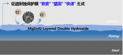 市面上普遍使用的鍍鋅材料,其耐蝕原理是在氧化過程中生成包含多個氣孔的飽和氧化皮膜層,隨著腐蝕因子(氧、水分、鹽分等)對氧化皮膜層的不斷侵蝕,表面鋅層厚度也不斷損耗,因此產(chǎn)品壽命受到極大影響。而這種革新性材料,其鍍層中的鎂(Mg)會促進非常穩(wěn)定狀態(tài)的致密腐蝕生成物LDH(Layered Double Hydroxide,層狀雙氫氧化物),再基于LDH形成全面的屏障并推遲腐蝕的發(fā)生,幾乎不發(fā)生損耗。