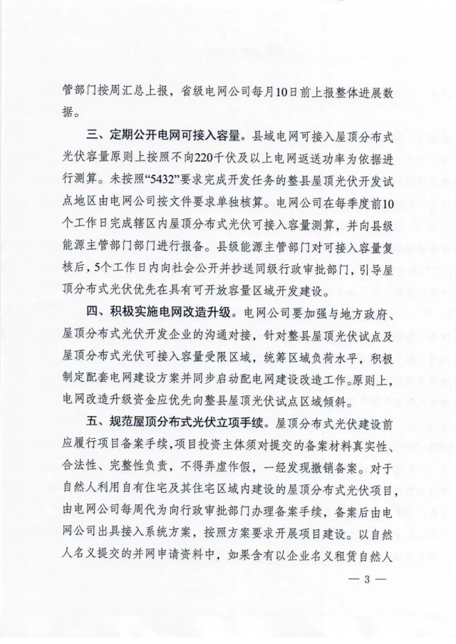 定期公開(kāi)電網(wǎng)可接入容量??h域電網(wǎng)可接入屋頂分布式 光伏容量原則上按照不向220千伏及以上電網(wǎng)返送功率為依據(jù)進(jìn)行測(cè)算。未按照“5432”要求完成開(kāi)發(fā)任務(wù)的整縣屋頂光伏開(kāi)發(fā)試點(diǎn)地區(qū)由電網(wǎng)公司按文件要求單獨(dú)核算。