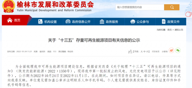 為全面梳理我市可再生能源項(xiàng)目建設(shè)信息,根據(jù)省發(fā)改委《關(guān)于梳理“十三五”可再生能源項(xiàng)目的通知》(陜發(fā)改能新能源﹝2022﹞1350號(hào)),現(xiàn)將我市第一批擬廢止的風(fēng)電、光伏發(fā)電項(xiàng)目予以公示(詳見附件),公示期為2022年10月24日至2022年11月1日。在此期間,如對(duì)項(xiàng)目存在異議,請(qǐng)以電話、傳真等方式向我委反映。單位意見需加蓋公章并注明聯(lián)系人和手機(jī)號(hào)碼,個(gè)人意見需提供真實(shí)姓名、身份證復(fù)印件和手機(jī)號(hào)碼等信息。