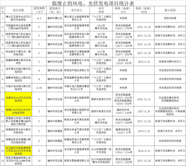 龍?jiān)锤?0兆瓦光伏電站項(xiàng)目廢止原因?yàn)椋簾o法落實(shí)建設(shè)條件、未按期建成投運(yùn);麻鎮(zhèn)30兆瓦生態(tài)光伏農(nóng)業(yè)電站項(xiàng)目廢止原因?yàn)闊o法落實(shí)建設(shè)條件、未按期建成投運(yùn);不具備建成投運(yùn);定邊縣華光新能源有限公司定邊50兆瓦光伏電站項(xiàng)目廢止原因:核準(zhǔn)文件延期失效、未開工。