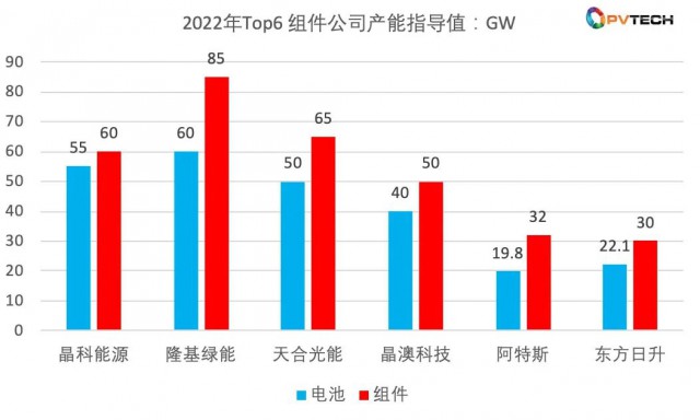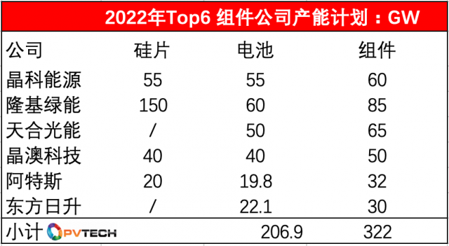 而根據(jù)晶科、隆基、天合、晶澳、阿特斯、東方日升 2022中報披露的數(shù)據(jù),到2022年底,各家組件規(guī)劃產(chǎn)能分別為60GW、85GW、65GW、50GW、32GW、30GW,這六 家公司2022 年底組件產(chǎn)能將達到322 GW,數(shù)值驚人。