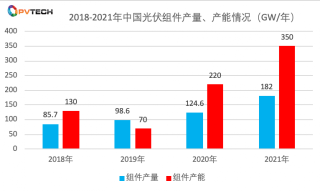 中國光伏行業(yè)協(xié)會(CPIA)數(shù)據(jù)顯示,2021年中國光伏組件產(chǎn)能為350 GW/年,同比增59.09%;該年實際組件產(chǎn)量為182GW,同比2020年增46.07%。