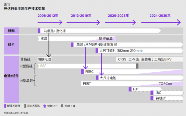 其一,單瓦組件成本長期將逐步下降,主要得益于技術(shù)演進帶來的轉(zhuǎn)換效率提升。電池組件主流技術(shù)正在快速演進迭 代( 如 圖 12),已 經(jīng) 從 傳 統(tǒng) P 型 向 PERC+ 和 N 型TOPCon 及 HJT 發(fā)展,未來隨著新型技術(shù)的發(fā)展,如具備成本優(yōu)勢的鈣鈦礦在突破穩(wěn)定性瓶頸后、其疊層電池大幅提升太陽光利用水平,將有可能進一步大幅降低降低單位成本。同時,隨規(guī)模效應(yīng)顯現(xiàn),單位產(chǎn)線投資成本下降以及人均產(chǎn)出率提升將進一步拉低電池組件成本。