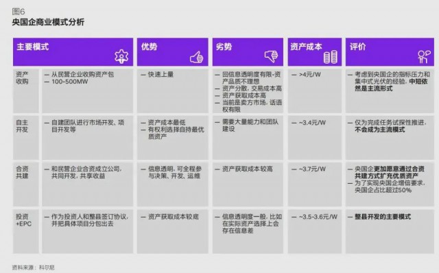 央國企更多考慮如何能更快速持有優(yōu)質(zhì)資產(chǎn),資產(chǎn)收購仍舊會是中短期的主流模式(如圖 6)。考慮到央國企的指標壓力和集中式光伏的經(jīng)驗,通過從民營企業(yè)收購資產(chǎn)包能夠幫助其實現(xiàn)快速上量。但同時該模式存在諸多劣勢:例如資產(chǎn)分散且品質(zhì)不理想、資產(chǎn)獲取成本高、信息透明度有限、賣方話語權(quán)過高等問題。為完成國家任務(wù)指標,近年來央國企也試探性推進資產(chǎn)成本更低的自建團隊開發(fā)模式,但由于需要大量能力與團隊建設(shè),自主開發(fā)暫不會不會成為主流模式。