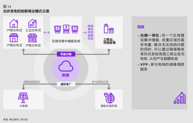 一邊是消納困局、一邊是電價短期波動風險,戶用光伏發(fā)電正經(jīng)歷著來自市場的新考驗。結(jié)合光伏發(fā)電商業(yè)模式判斷,未來光儲一體化和虛擬電網(wǎng)兩種創(chuàng)新模式的發(fā)展或成為針對上述挑戰(zhàn)的最優(yōu)解法(如圖 14)。