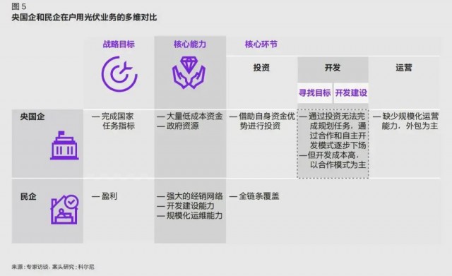 由于央國企和民營企業(yè)對于戶用光伏的戰(zhàn)略定位、切入賽道和自身能力均不同,因此其各自具備獨特的商業(yè)模式,且在產(chǎn)業(yè)鏈上逐漸形成互補合作的上下游關(guān)系(如圖 5)。