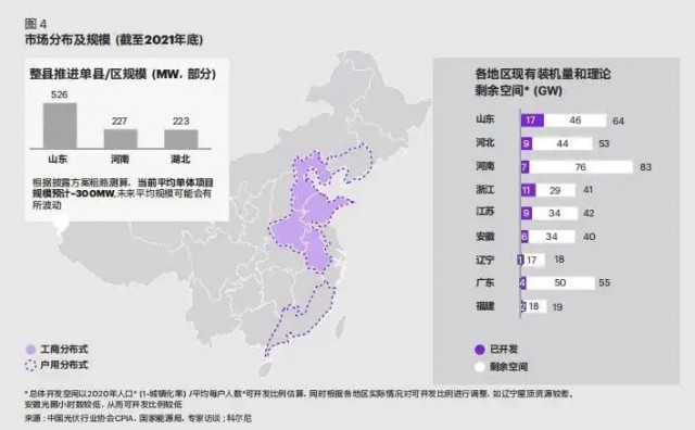 綜合考慮市場空間、綜合條件、產(chǎn)權(quán)模式等因素,科爾尼認為山東、河北、河南、浙江、江蘇、安徽、遼寧、廣東與福建為未來整縣推進領(lǐng)域的九大高潛力市場。其中,山東、河北、河南地區(qū)雖競爭激烈,但可開發(fā)空間仍十分可觀;浙江、江蘇由于居民投資意識強,整體出售市場更具吸引力;安徽、遼寧、廣東、福建綜合條件優(yōu)勢明顯,建議重點布局。根據(jù)測算,當前整縣推進的平均單體項目規(guī)模預(yù)計在300MW 左右(如圖 4)。