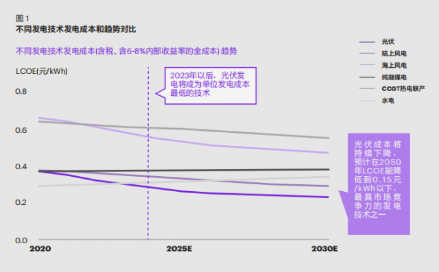 能源結(jié)構(gòu)調(diào)整無疑是能源戰(zhàn)略中最重要的一環(huán)。在眾多新能源發(fā)展路線中,光伏是最優(yōu)質(zhì)的選項之一,光伏發(fā)電技術(shù)成本優(yōu)勢突出??茽柲犷A(yù)測,到 2023 年后,光伏發(fā)電的平準化度電成本(LCOE)將在所有發(fā)電技術(shù)中達到最低,并預(yù)計在 2050 年進一步下降至 0.15 元 /kWh(如圖 1)。成本優(yōu)勢下,光伏有潛力成為未來中長期發(fā)展最快的細分賽道。