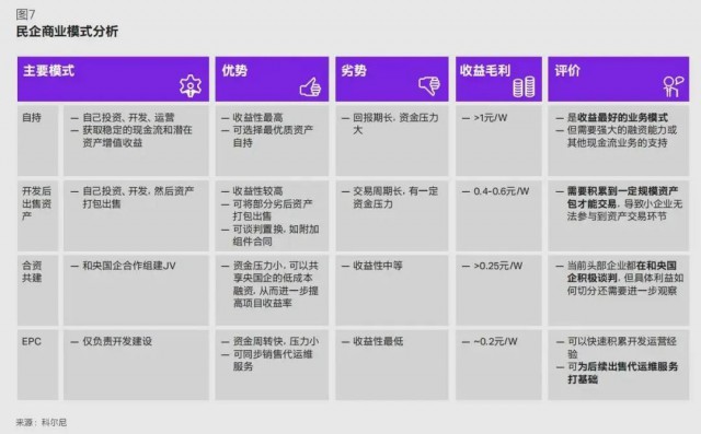 自持資產(chǎn)包是民企的主流業(yè)務(wù)模式。民企通過全程進行投資、開發(fā)與運營,獲取穩(wěn)定的現(xiàn)金流和潛在資產(chǎn)增值收益,是當前收益最好的模式,毛利可超過 1 元 /W。但由于對資金要求較高且回報周期長,通常需要強大的融資能力或其他現(xiàn)金流業(yè)務(wù)的支持。