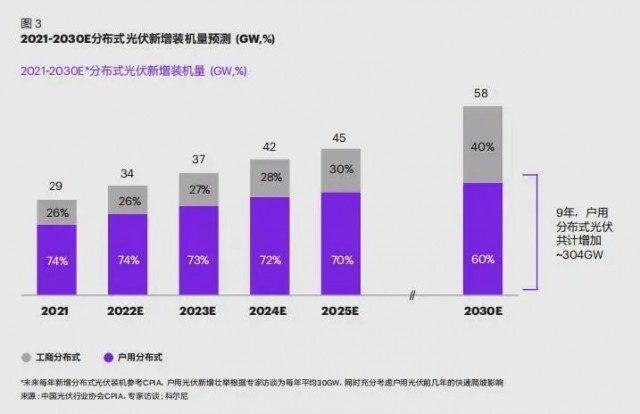 根據(jù)市場趨勢,科爾尼認為, 2025 年以前戶用光伏會在政策和盈利性提升驅(qū)動下大幅提速,后期隨著整縣推進結(jié)束,預(yù)期 2025-2030 增速會略有放緩。保守預(yù)計中國市場到 2030 年將累計增加戶用光伏超過 300GW,市場空間廣闊(如圖 3)。