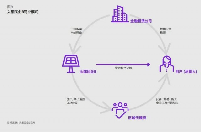 與民企 A 大量資產(chǎn)自持模式不同,民企 B 打造了一條輕資產(chǎn)模式(如圖 8):引入金融租賃公司授信托底,自己則作為開發(fā)方賺取差價,同時提供帶運維服務(wù)以獲得持續(xù)的管理費收入。民企B的核心優(yōu)勢在于其家電業(yè)務(wù)所積累的廣泛渠道資源,與此同時,通過大幅度讓利經(jīng)銷商并提供更快付款節(jié)奏,公司在前期搶占了部分市場資源。