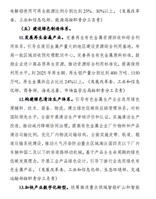 提高可再生能源使用比例,鼓勵(lì)企業(yè)在資源環(huán)境可承載的前提下向可再生能源富集地區(qū)有序轉(zhuǎn)移,逐步減少使用火電的電解鋁產(chǎn)能。利用電解鋁、工業(yè)硅等有色金屬生產(chǎn)用電量大、負(fù)荷穩(wěn)定等特點(diǎn),支持企業(yè)參與以消納可再生能源為主的微電網(wǎng)建設(shè),支持具備條件的園區(qū)開展新能源電力專線供電,提高消納能力。鼓勵(lì)和引導(dǎo)有色金屬企業(yè)通過(guò)綠色電力交易、購(gòu)買綠色電力證書等方式積極消納可再生能源,確??稍偕茉措娏ο{責(zé)任權(quán)重高于本區(qū)域最低消納責(zé)任權(quán)重。力爭(zhēng)2025年、2030年電解鋁使用可再生能源比例分別達(dá)到25%、30%以上。